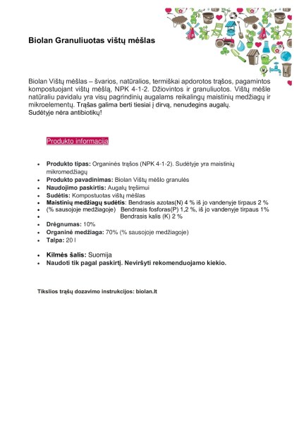 Pagrindinės charakteristikos: Produkto tipas: Organinės trąšos (NPK 4-1-2). Sudėtyje yra maistinių mikromedžiagų;