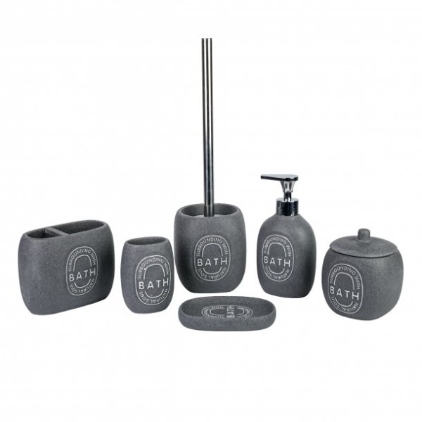 Komplektacija: dantų šepetėlių laikiklis, 2 puodeliai, muilinė, skysto muilo dozatorius, WC šepetys su laikikliu