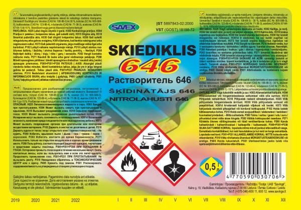 Dėmesio!!! Sudėtyje yra: toluenas (CAS 108-88-3), ksilenas (EC 905-562-9), butilacetatas (CAS 123-86-4), n-butanolis (CAS 71-36-3), acetonas (CAS 67-64-1), metanolis (CAS 67-56-1). Skiedžiant naują gaminį išbandyti mažame kiekyje!
